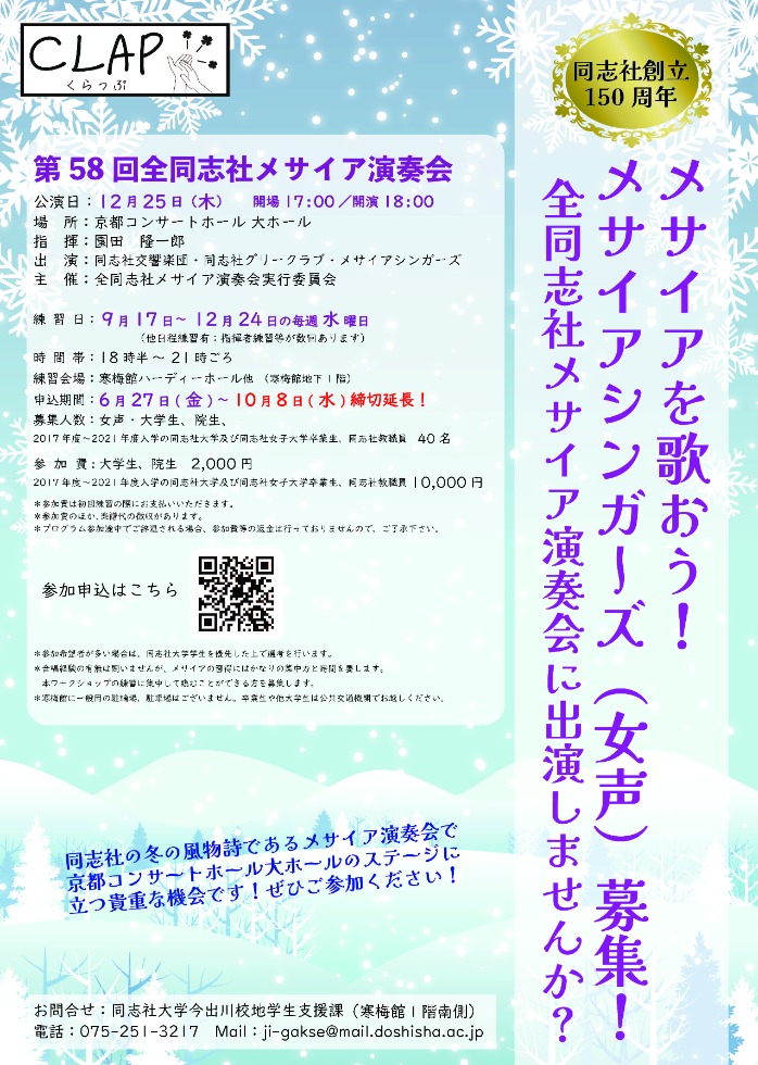募集人数 | 女声・大学生、院生、2017年度~2021年度入学の本学卒業生及び同志社女子大学卒業生、同志社教職員 40名 |